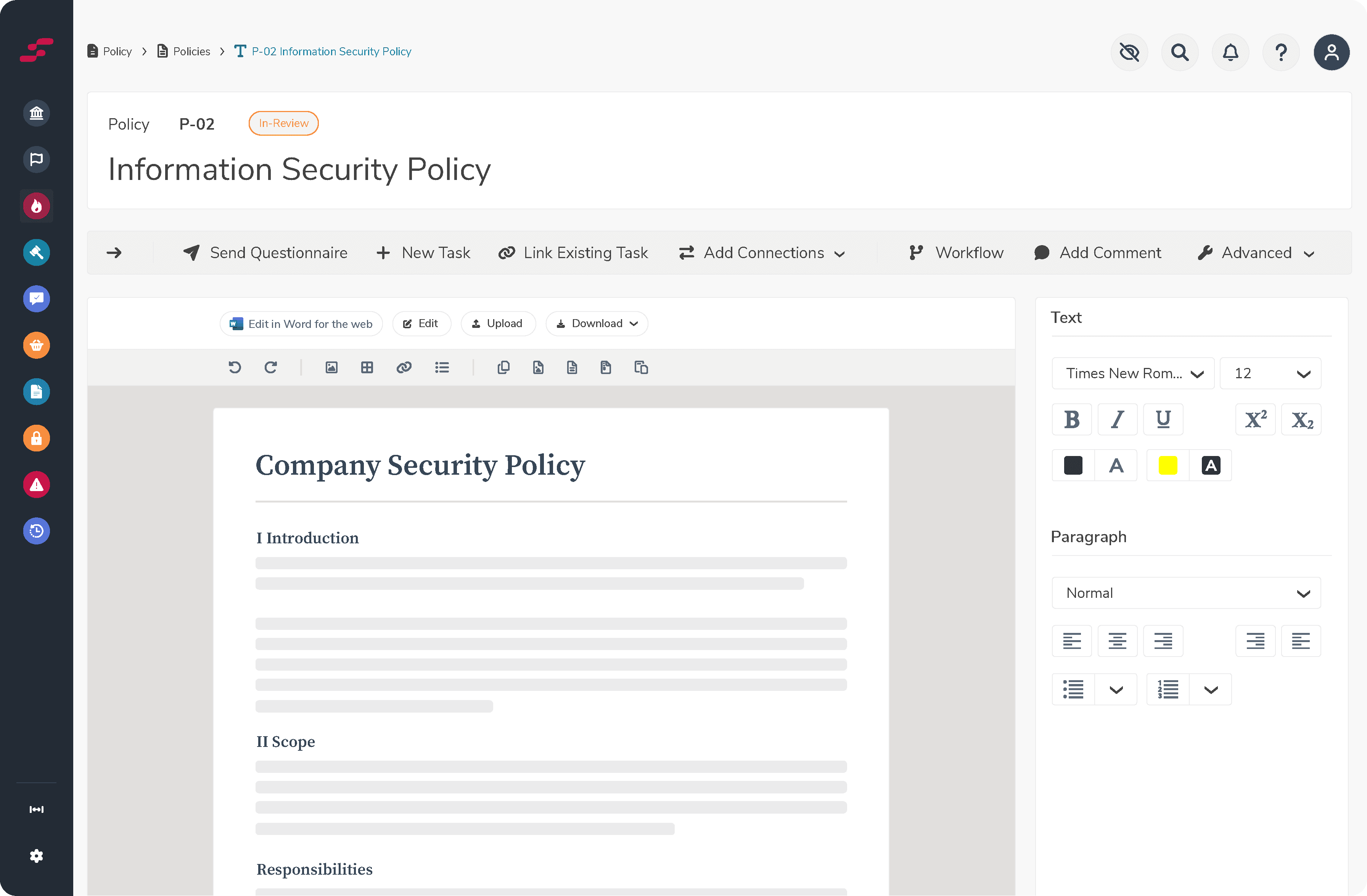 Write and edit policies without leaving the platform. Leverage Microsoft Word integration or use built-in editor.